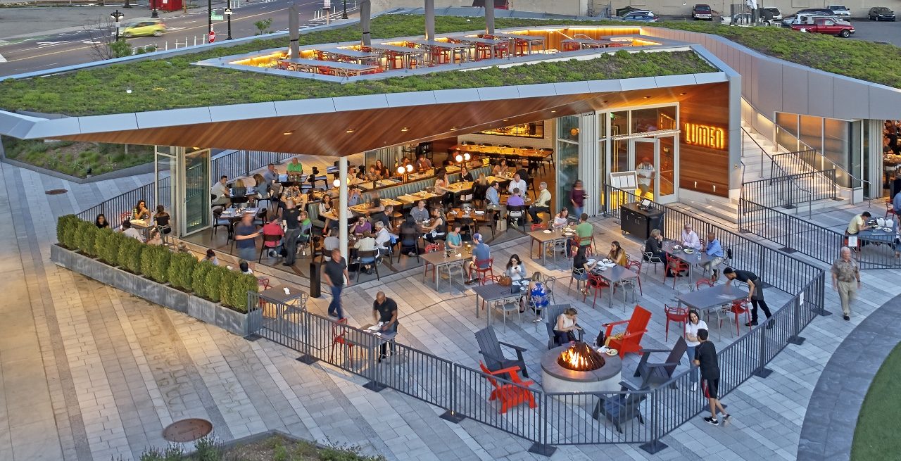 Lumen Detroit's design, top photo, featuring sliding glass wall systems, allowed it to thrive and remain open during the pandemic by connecting the interior to Beacon Park. The operable walls, rising over 10 to 12 feet, create an expansive, indoor-outdoor space, adding 1,200 sq ft of seating. The glass perimeter walls completely open on both halves of the building, the bar, and the dining room.