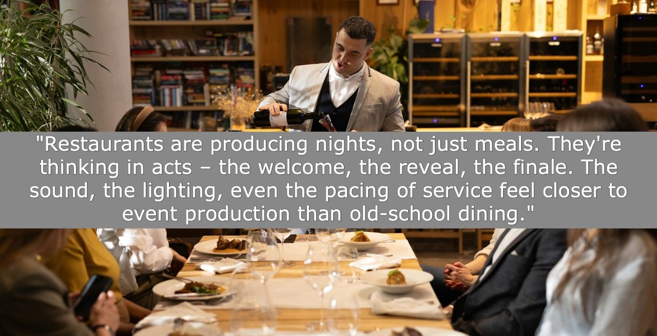 “Restaurants are producing nights, not just meals. They're thinking in acts – the welcome, the reveal, the finale. The sound, the lighting, even the pacing of service feel closer to event production than old-school dining.”