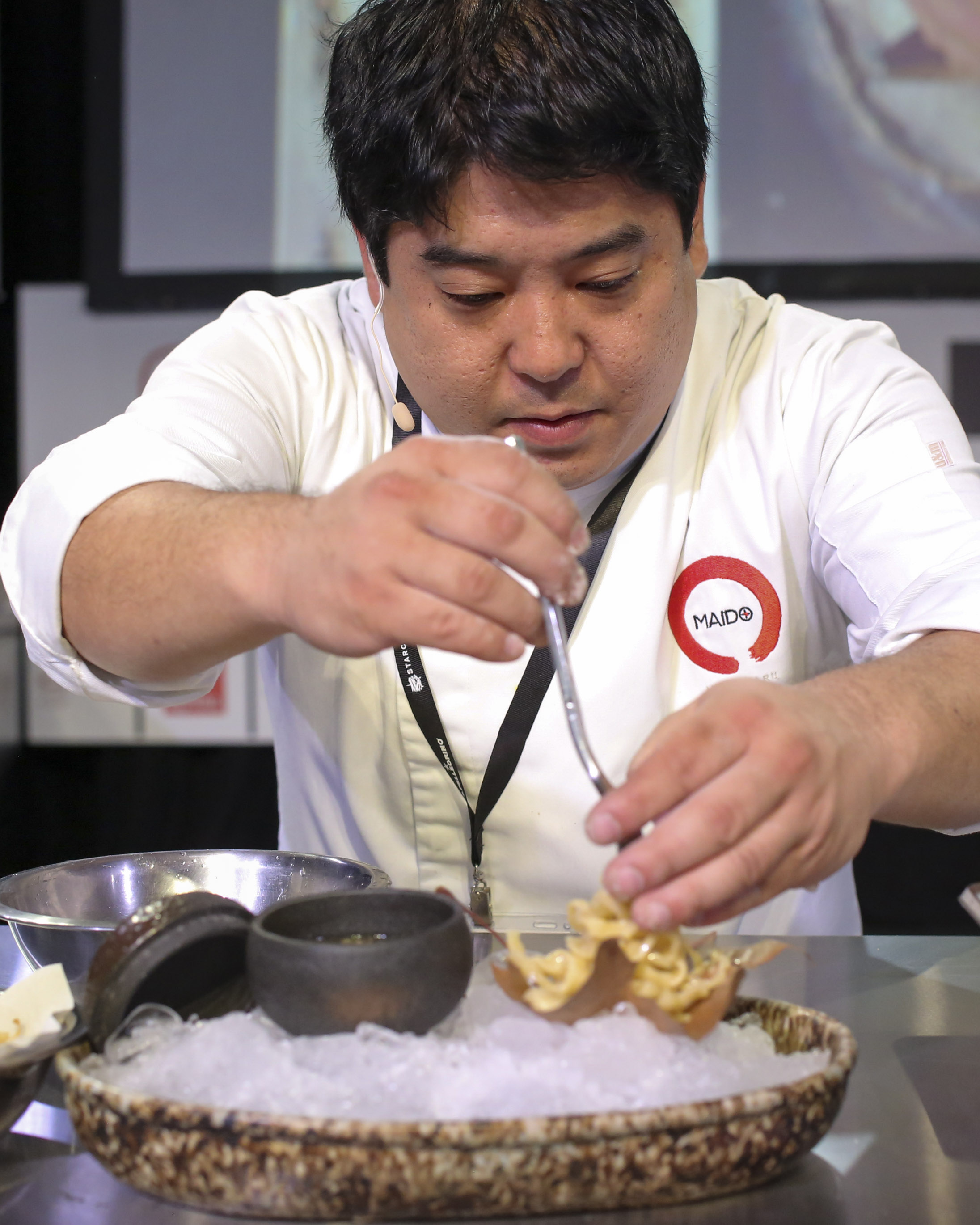 Hundreds of visitors to the Peru booth to view the technique of Chef Mitsuharu Tsumura and sample the dishes which included ceviche de Abalone with Leche de tigre transformed by liquid nitrogen. Chef “Micha’s” Main Stage demonstration showcased the new tasting menu as his Lima restaurant which represents and respects 200 miles of the Peruvian coastline and the sustainable fishing practices Maido supports. Notable guests who participated in the Main Stage presentation included celebrity chef David Burke, Chris Consentino, Wylie Dufresne, Elizabeth Faulkner and Kara Newman.